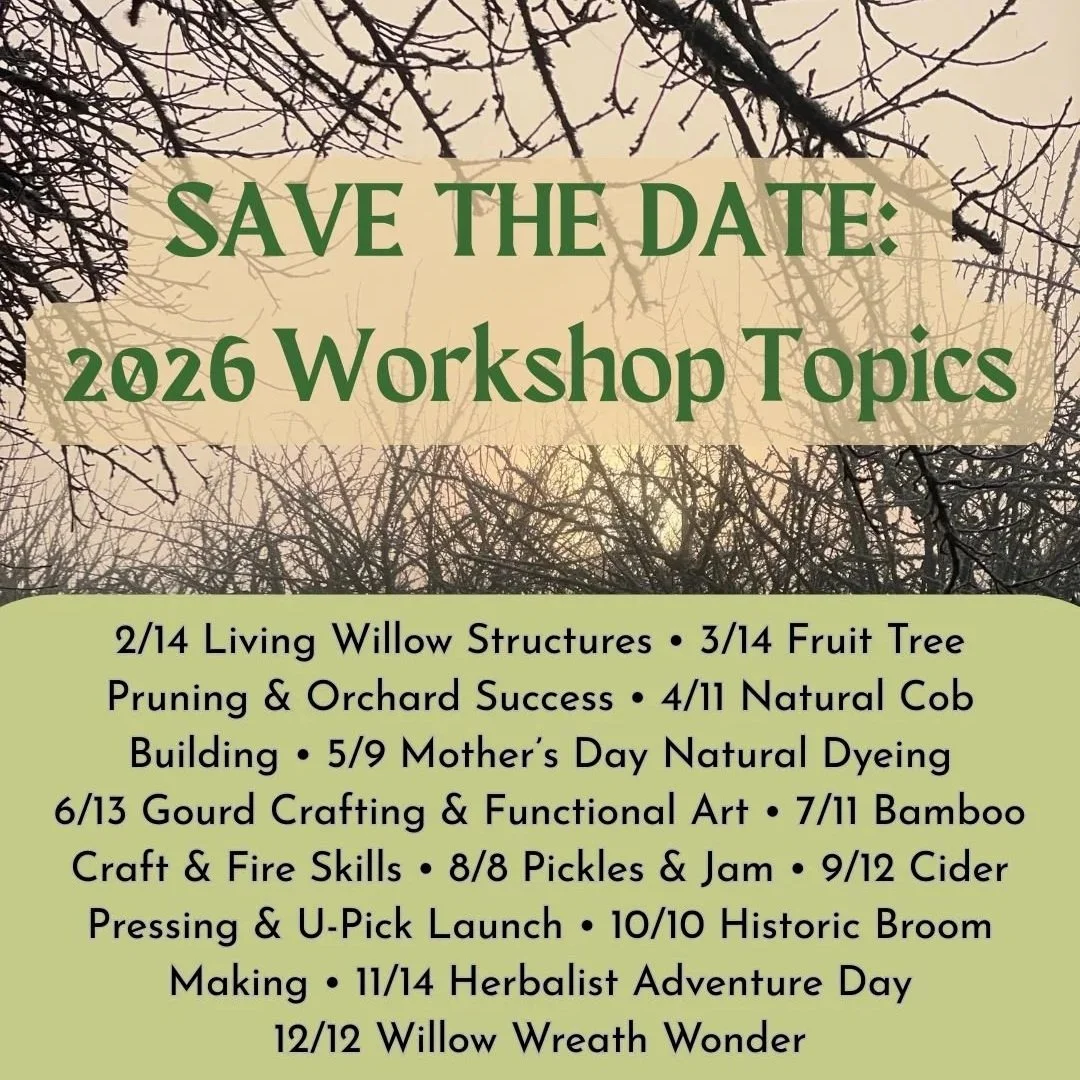 2/14 Living Willow Structures • 3/14 Fruit Tree Pruning & Orchard Success • 4/11 Natural Cob Building • 5/9 Mother’s Day Natural Dyeing • 6/13 Gourd Crafting & Functional Art • 7/11 Bamboo Craft & Fire Curing • 8/8 Pickles & Jam • 9/12 Cider Pressing & U-Pick Launch • 10/10 Historic Broom Making • 11/14 Herbalist Adventure Day • 12/12 Willow Wreaths
